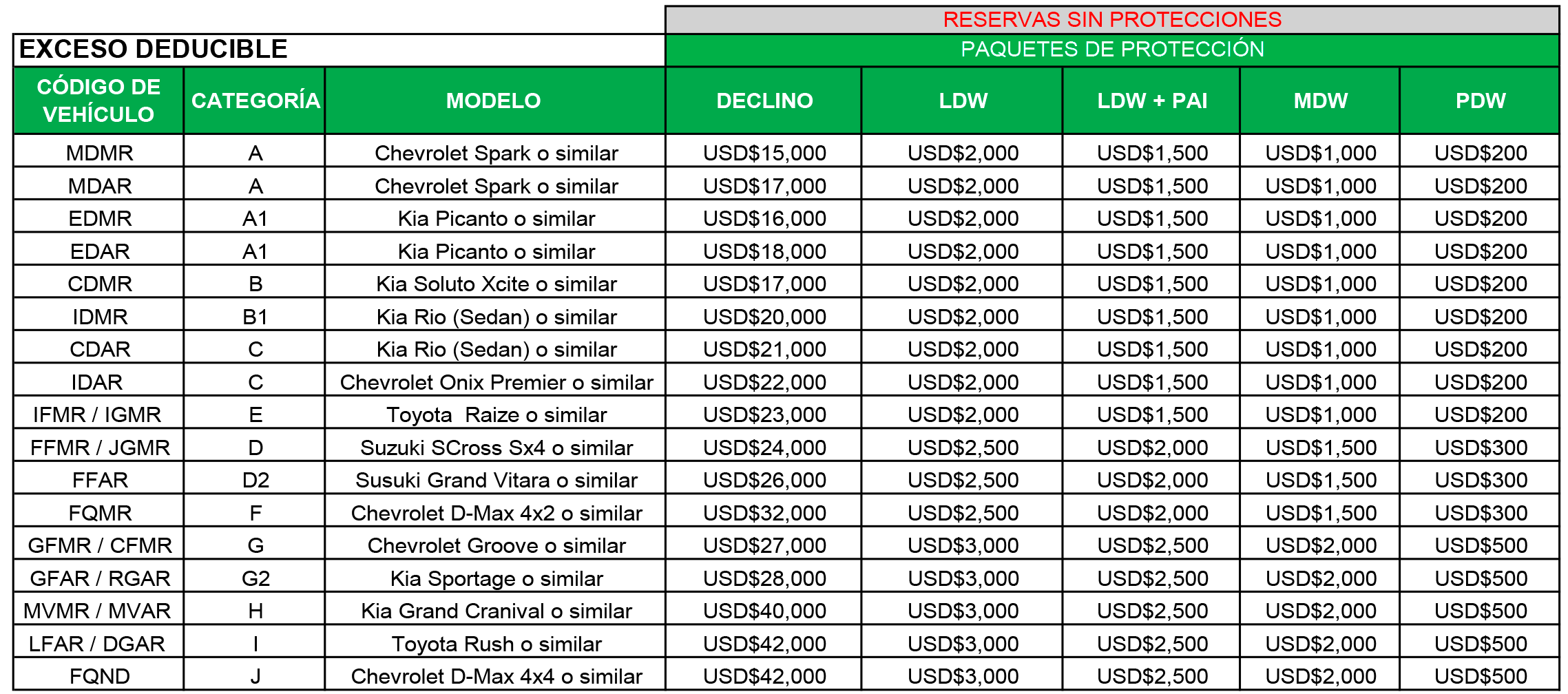 - CFMR, RGAR, DGAR, LFMR, LFAR, FQND, MVAR, LVMD: USD$150/día con responsabilidad de hasta USD$500 de exceso.