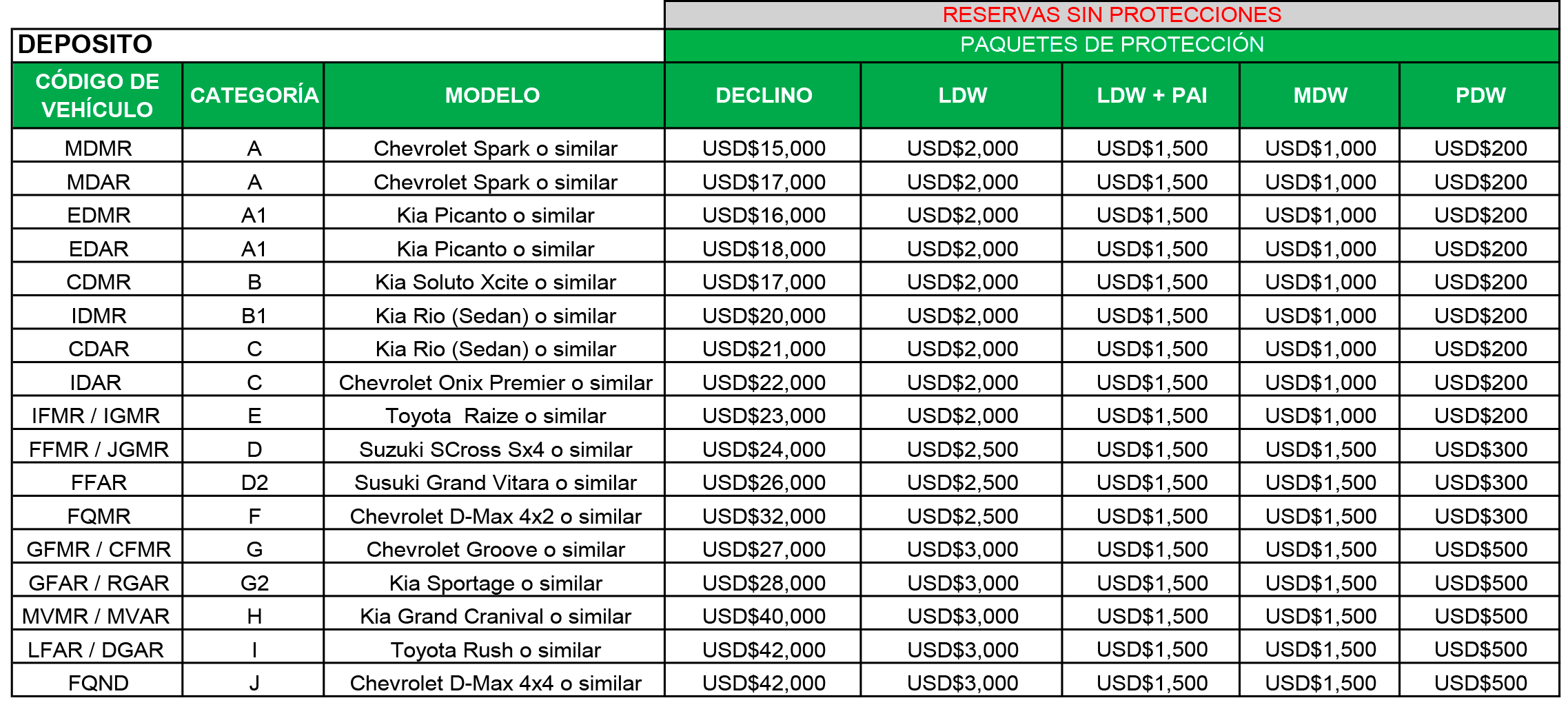 - JGMR, FQMR, FFAR: USD$100/día con responsabilidad de hasta USD$300 de exceso.